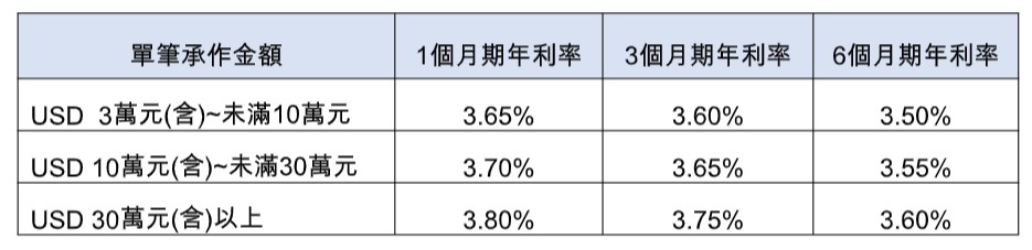 華南銀行自即日起至明(115)年2月2日止,推出【馬上美利美元優利定存專案】,凡國內分行客戶以新臺幣結購、自他行匯入或外幣現鈔存入之新資金承作該專案,依金額區分三種級距,不需搭配其他商品,更無帳戶類型限制,最高可享1個月期年利率3.8%、3個月期年利率3.75%、6個月期年利率3.6%。