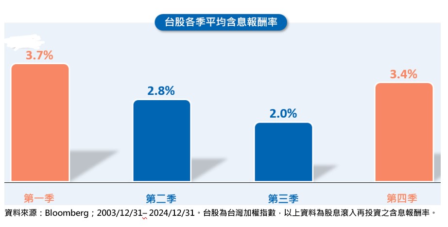 凱基台灣 TOP 50 ETF(009816)基金研究團隊表示,每年第一季因為有過年前的提前拉貨及紅包行情,往往為台股旺季。觀察台股各季平均含息報酬率,每年第一季以平均3.7%的含息報酬率拔得頭籌,更勝第四季3.4%、第二季2.8%,及第三季的2%。投資人若想掌握台股行情,年初正是進場的好時機。