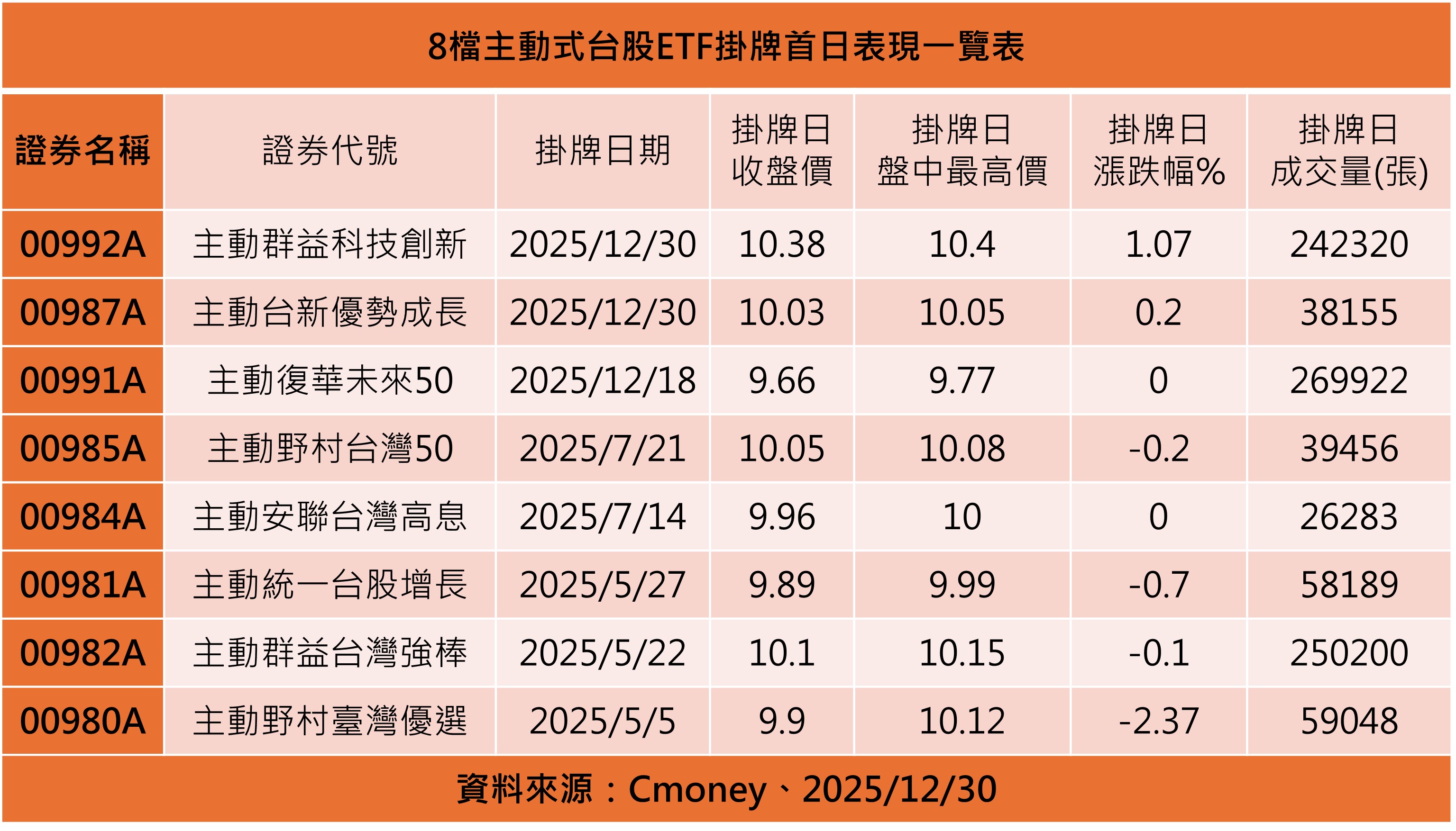 今天有2檔主動式台股ETF掛牌,包括00992A主動群益科技創新、00987A主動台新優勢成長,通通不畏台股拉回,逆勢收漲,其中,00992A終場收10.38元,單日漲幅近1.07%,成交量衝上24萬餘張,是今天的ETF成交王、也是台股第三大量。