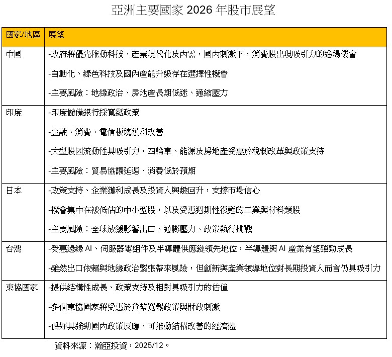 瀚亞投資投資長Vis Nayar表示,股市2025年波動持續,但仍創下新高,展望2026年,預期亞洲主要經濟體(中國、印度及日本)將受惠於政策驅動機會,東協國家的成長,將由政策推動,而北亞則可望受惠於全球AI基礎建設擴張帶動。亞洲內部的成長分化,加上市場集中度提升,更凸顯出謹慎、主動管理操作以創造超額報酬的重要性。