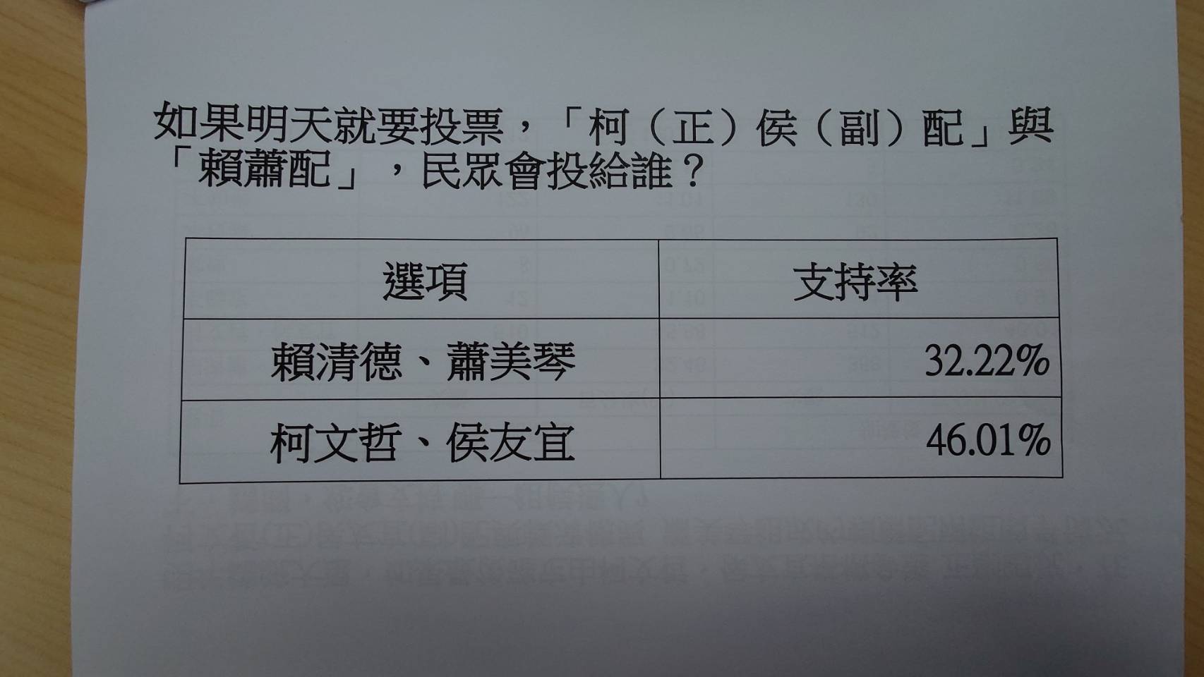 藍白合民調結果將於17日晚間由3位民調專家評選出爐,台灣競爭力論壇17日下午公布手機、市話綜合民調,「柯侯」以46.01%贏過「賴蕭」的32.22%,「侯柯」則以40.82%領先「賴蕭」35.86%,本份民調「柯侯」贏「侯柯」超越誤差範圍,若被計入藍白合「柯侯」得1點。