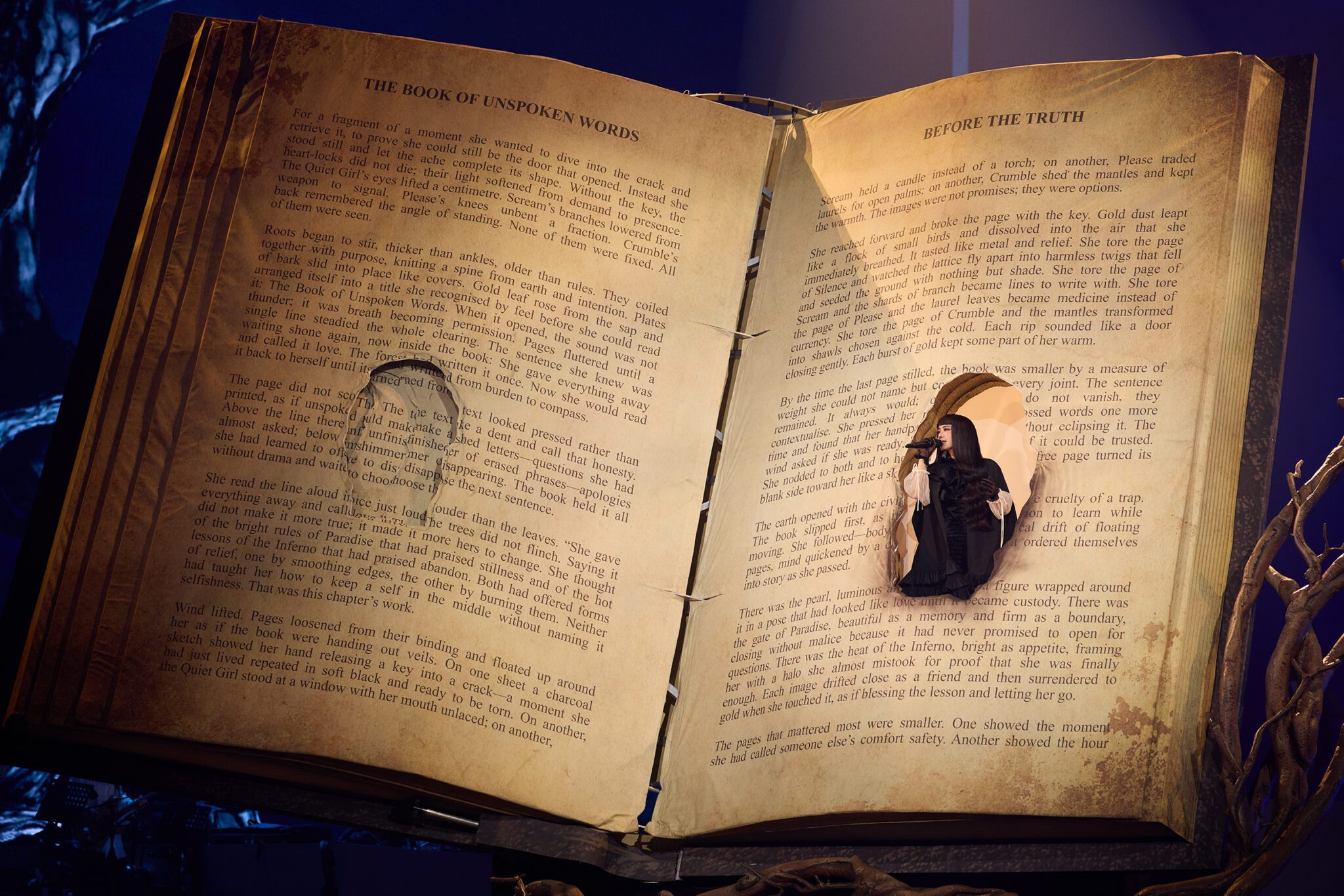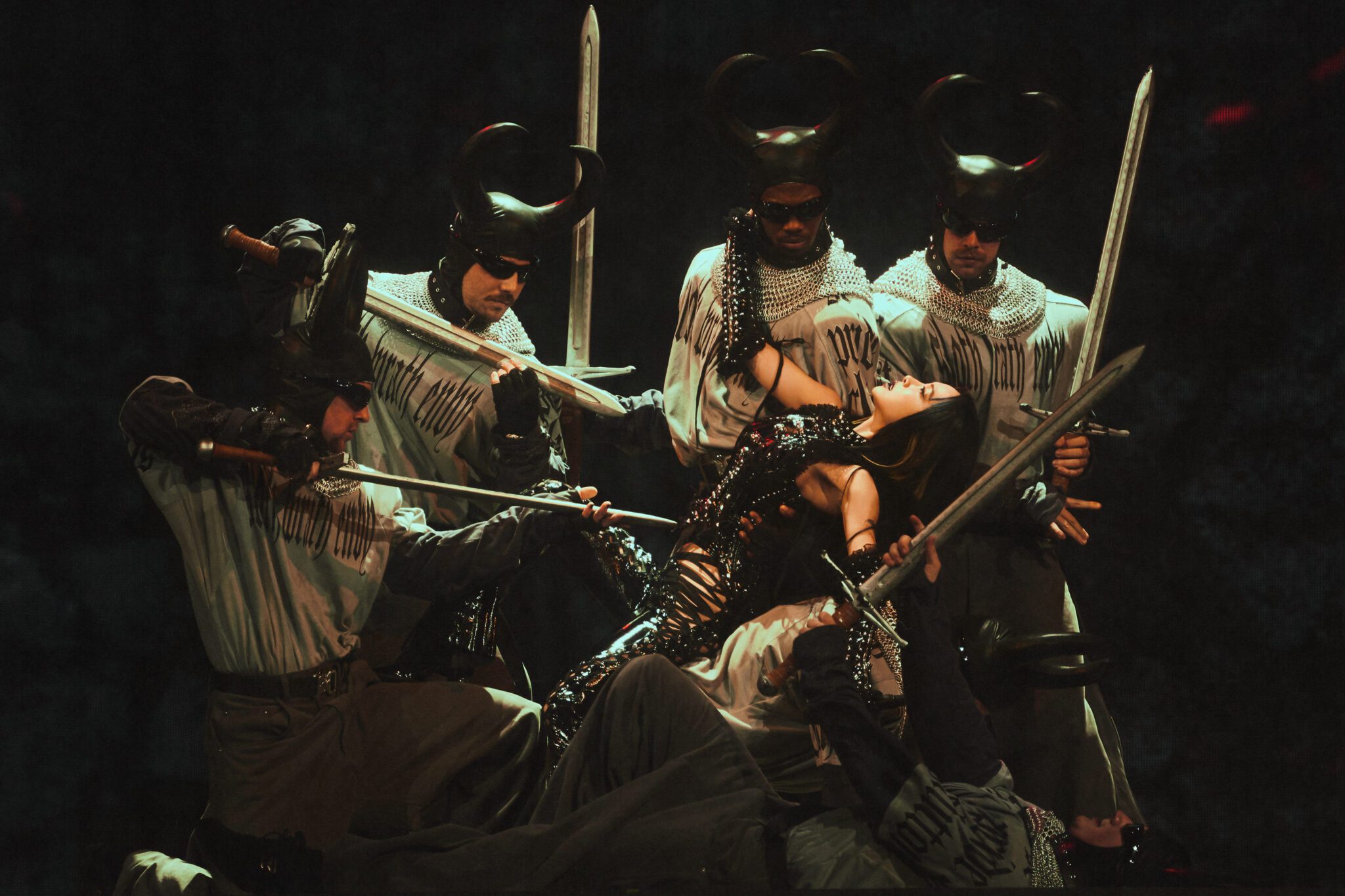 JOLIN 此次巡演中,每一個章節都配置一座極具象徵意義的巨型道具,為整體敘事畫龍點睛;從開場震撼全場的「慾望巨蟒」、第二篇章令人印象深刻的「禁忌之劍」、「貪婪金豬」,到情歌組曲篇章象徵對愛情迷惘及頓悟的〈真相之書〉、甜蜜段落中翱翔全場的「彩翼飛馬」,以及終章壓軸現身的「愉悅之女」巨型雕像,每一件道具一登場都引發全場驚嘆;再加上各章節精心鋪陳、層層堆疊的大量細節道具,更讓整場演出宛如一座的立體寓言舞台,處處暗藏巧思,值得細細品味。其中在第二章節開場時震撼登場的「禁忌之劍」,以極具壓迫感的巨大比例與冷冽線條漂浮在觀眾席上,不僅視覺震攝且份量十足;此外,此篇章以「劍」作為核心象徵,讓舞者們在「煉獄劍林」中穿梭,更大膽攀爬於高聳利劍之上,恣意倒吊、搖擺翻轉,挑戰人體極限的高難度演出,讓整段舞台張力爆表!而利劍本身就重達30多公斤,堪稱是舞台上的「重量級道具」,在舞台移動搬運時,成了特技舞者的體能大考驗!讓 JOLIN 在彩排時也忍不住笑說:「真的勾起我之前巡演時練鋼管舞的熱血日子!」