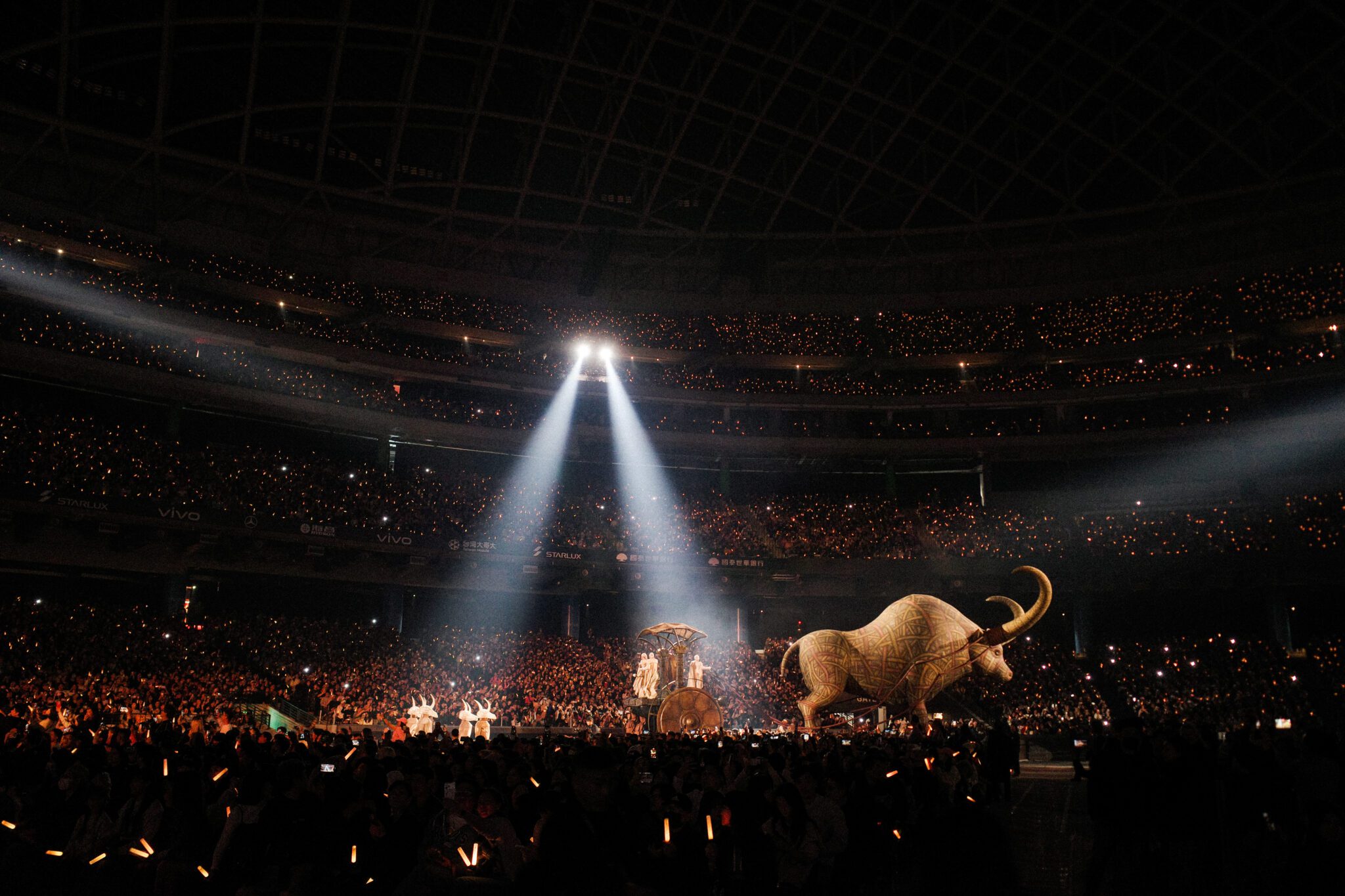 而在所有巨型道具之中,最令人難忘的莫過於第二篇章〈PLEASURE ECHOES PAIN(愉悅在苦痛中迴盪)〉中登場的「貪婪金豬」,不僅同時肩負 JOLIN 的霸氣坐騎與主舞台核心裝置,更內建讓全場歌迷嗨翻的「吐鈔機」功能,普發「愉悅紙鈔」,集視覺震撼、敘事象徵與娛樂效果於一身,可說是功能性與話題性兼具的舞台焦點。不過也正因為「一豬多用」、內部結構極為複雜,製作成本價格不斐,四噸重的豬體連同運費便高達 120 萬美金(約新台幣 3,600 萬元),且必須包下整架貨機才能完整運送來台,也因此讓工作人員趣稱它是「坐飛機來的豬」,堪稱名副其實、身價不凡的「金豬」,也再次印證 JOLIN 演唱會在製作規格與舞台美學上的極致追求。