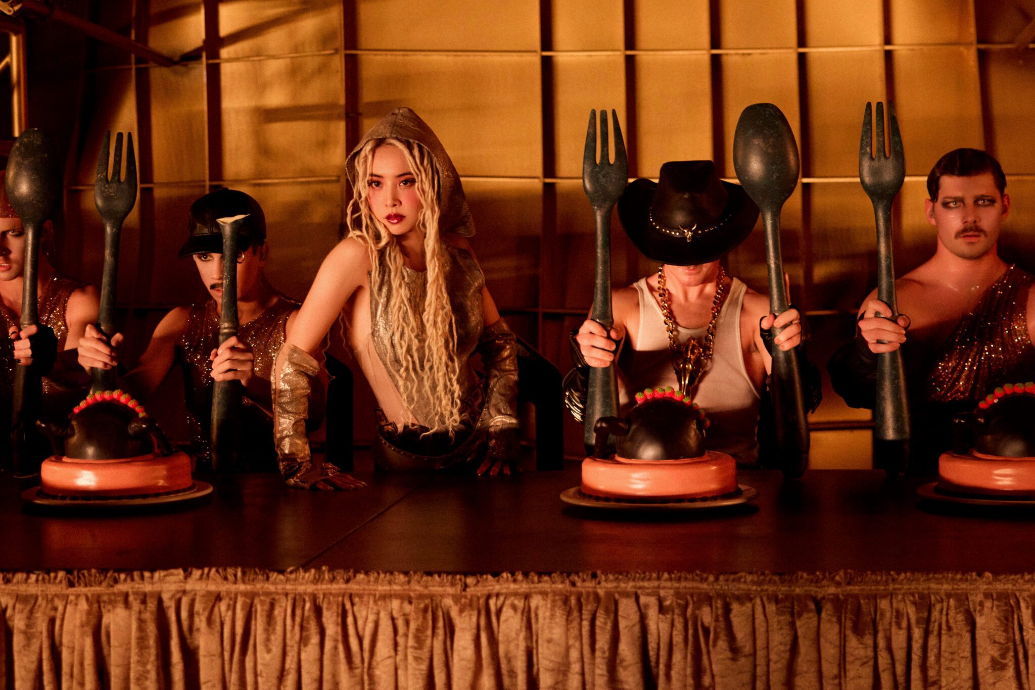 出走到「慾望異域」的 JOLIN隨後進入第二章節下半段場景「感官樂土」,當樂園使者敲叩慾望之門後,大門緩緩敞開,身披金色「魅慾女王」造型的JOLIN霸氣站在象徵集結貪、嗔、癡、慾於一身的巨型「貪婪金豬」上,高唱〈BLOODY MARY〉掀起全場高潮,隨著歌詞中不斷高喊的 “MONEY MONEY”,金豬瞬間化身為瘋狂吐鈔的撒鈔機,大量「愉悅紙鈔」自高空傾瀉而下,將舞台轉化為一座由金錢、慾望與感官刺激交織而成的原慾樂園,隨即在低吟〈HUSH LITTLE BABY〉與演唱〈我超會〉時,特技舞者攀爬金豬結構上下翻騰,展現宛如極限人體藝術的震撼畫面,令人目不轉睛;接著舞台瞬間轉換成名畫「最後的晚餐」場景,十二名舞者高舉印有 JOLIN 臉孔的蛋糕,透過〈甜秘密〉隱喻食慾的失控與誘惑,將感官慾望推向更具戲劇張力的層次。而最後在〈WOMAN’S WORK〉、〈美人計〉歌聲中,JOLIN 高躺於床榻之上,以極具張力且充滿美感的性感肢體語彙詮釋「色慾」本質,為第二章節畫下充滿想像空間的句點!