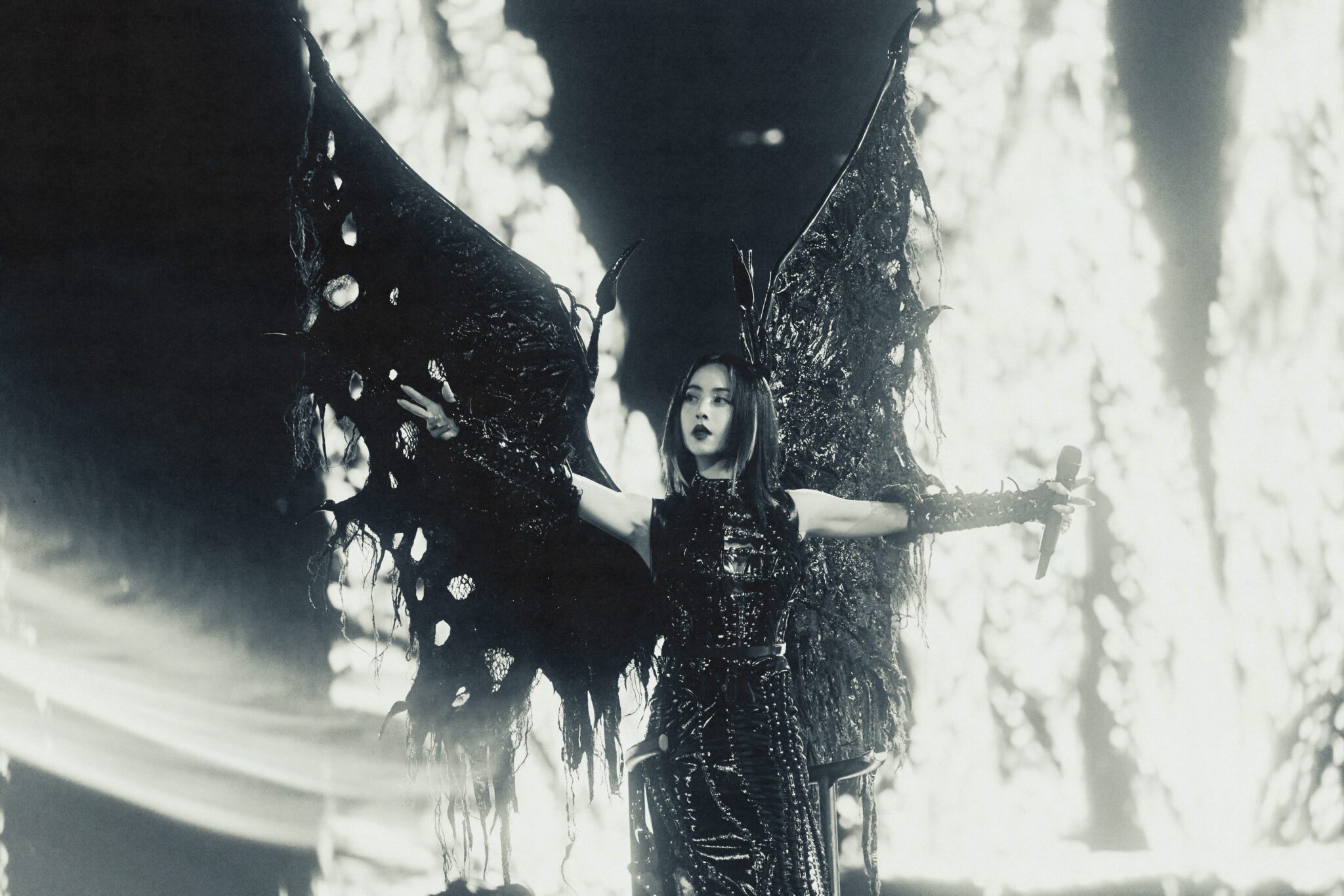 以「愉悅」能量陪伴歌迷送舊迎新的 JOLIN在 2026 元旦場演唱會上續譜《PLEASURE》愉悅宇宙篇章,繼續帶領歌迷踏上尋找自我與自由的「人間樂園」旅程;其中第二章〈PLEASURE ECHOES PAIN(愉悅在苦痛中迴盪)〉被視為全場最重量級的黑暗寓言章節,特別以上下段落的雙篇結構,詮釋人在慾望拉扯中墜落、掙扎與重生的心境轉折,從第二段開始的 VCR 中,JOLIN 墮入象徵人性試煉的「慾望異域」,開場頂著巨型暗黑翅膀化身為「魔女莉莉絲」的她站上三層樓高、十公尺長「禁忌之劍」漂浮於觀眾席上震撼登場,在演唱完〈惡之必要〉後,樂園使者駕著黑馬現身舞台迎接JOLIN,隨後及展開一連串招牌舞曲〈特務 J〉、〈大藝術家〉、〈你也有今天〉及〈HOT WINTER〉,當中穿插舞者攀上高聳利劍,並在劍身上恣意搖擺甚至倒掛「演出,挑戰人體極限的高難度特技與舞台超狂視覺同步並進,動感及視覺張力爆表,令人目不暇給!