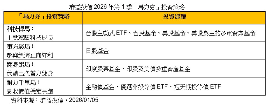 群益投信指出,2026年投資人必須要有的第1匹良馬是「科技悍馬」,雖然近期浮現AI泡沫疑慮,不過AI應用持續擴散,加速科技產業發展,也帶動AI供應鏈獲利上修,更為股市成長帶來強勁動能,其中又以台股、美股表現最值關注。