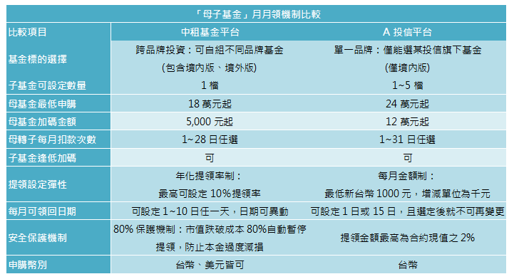更重要的是,由於提領資金來源為母基金的部分贖回,性質上屬於「資本利得」而非「配息收入」。若是境內版母子基金,其資本利得免稅;若是境外版的母子基金則併入海外所得計算最低稅負制,但免稅額高達750萬元,幾乎等同於富人條款。