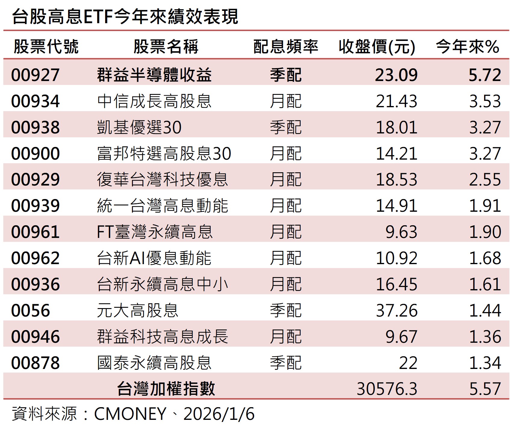統計台股高息ETF今年來截至6日為止,群益半導體收益(00927)上漲5.72%,是唯一戰勝大盤的台股高息ETF。