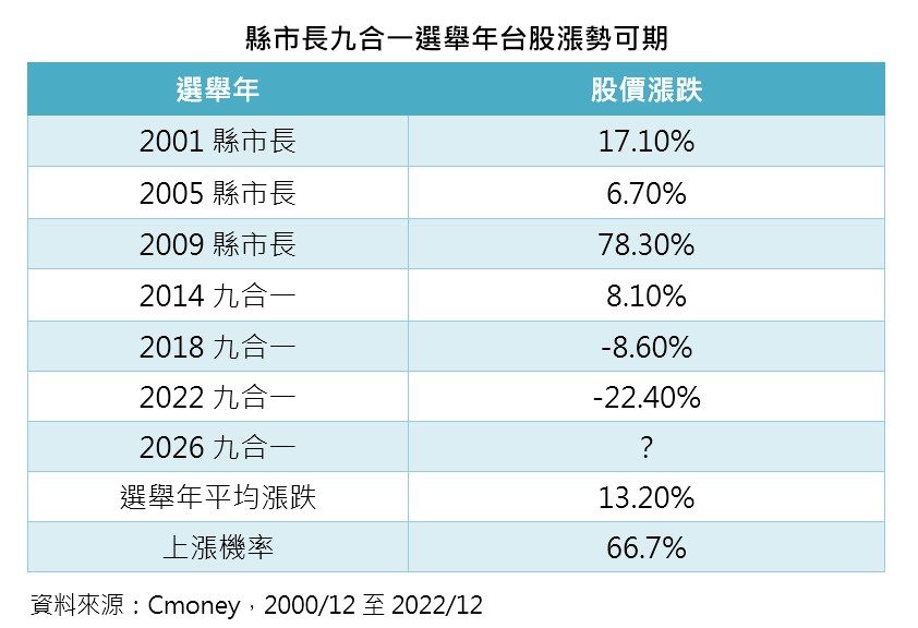 張正中指出,美國11月將舉行期中選舉,美國總統川普為拉抬選情與民調支持度,預料將在2026年釋放穩物價、降關稅、寬融資等多項政策利多,有利金融市場後市;同樣,台灣年底將舉行九合一選舉,按過往多有選舉年行情助攻2000年至2022年縣市長、九合一選舉年,台股當年度平均漲幅13%,上漲機率達67%。