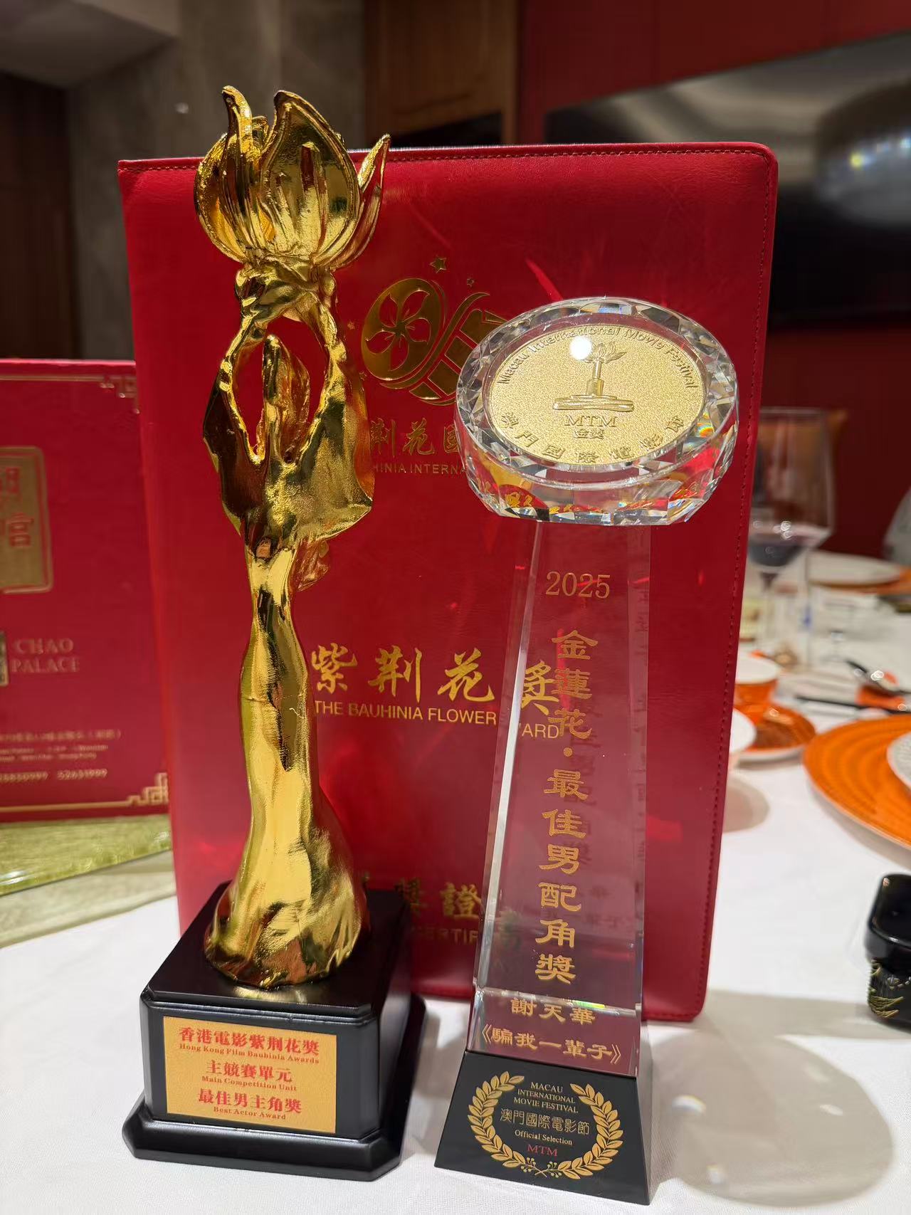 當天,謝天華同樣憑《騙我一輩子》拿下【第17屆澳門國際電影節】金蓮花獎「最佳男配角」,被推派擔演頒獎人,謝天華一拿到「最佳男主角」獎座就忍不住先「演」了一下重量感,笑稱男主角的獎座相當「沉甸甸」份量十足,現場立刻笑成一片,輪到陳曉東接過獎座後開心爆表,將獎座當成麥克風氣氛直接拉滿,模仿起謝天華近期獻唱《愛很簡單》的唱腔與神情,一邊唱、一邊加碼扭動臀部,瞬間把抒情歌唱成「熱舞版」,畫面相當熱鬧逗趣全場笑聲不斷。