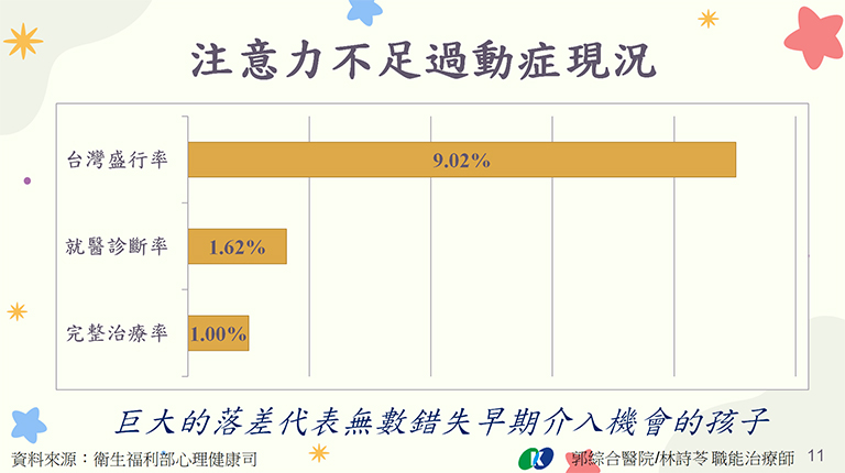 郭綜合醫院復健科林詩苓職能治療師指出,在孩子的成長過程中,有些孩子常被貼上「過於活潑」或「調皮搗蛋」的標籤,但其行為背後,可能隱藏著一種常見的神經發展性障礙-注意力不足過動症。根據衛福部2023年的統計,台灣ADHD的盛行率約為9.02%,意即每10個孩子中就有將近1人可能受到影響。然而,值得警惕的是,目前只有1.62%的孩童接受了正式的診斷及治療。這巨大的落差顯示,許多孩子們可能正在獨自面對學習與社交的困境,需要社會給予更多的關注與醫療資源。