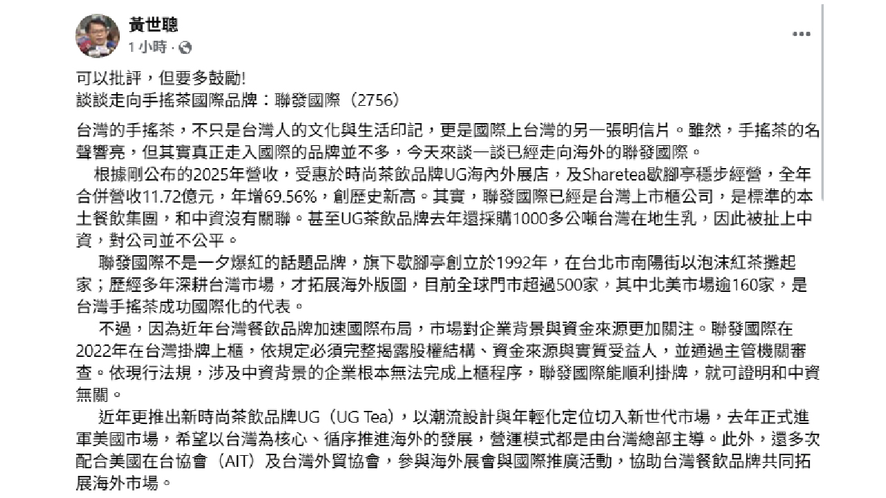 根據上週五媒體報導,聯發國際受惠於時尚茶飲品牌UG海內外展店,及Sharetea歇腳亭穩步經營,2025年合併營收11.72億元,年增69.56%,創歷史新高。財經專家黃世聰在臉書發文,台灣手搖茶是國際上台灣的另一張明信片,雖然手搖茶的名聲響亮,但其實真正走入國際的品牌並不多,已走向海外的聯發國際是台灣上市櫃公司,本土餐飲集團,UG茶飲品牌去年還採購1000多公噸台灣在地生乳,和中資沒有關聯。前段時間被扯上中資,對股東不公平。