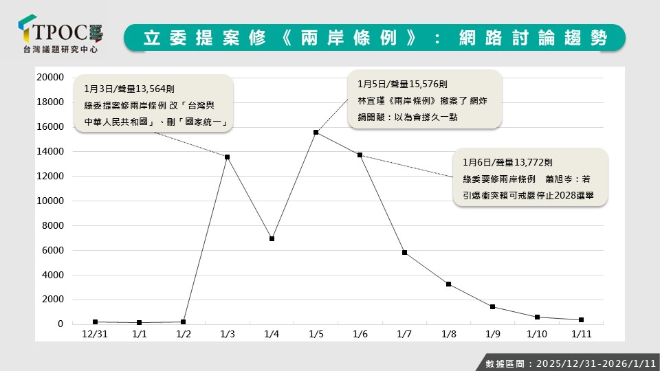 自民進黨立委林宜瑾提出修正《兩岸人民關係條例》,欲透過修法正名兩岸分屬兩國後,兩岸議題迅速升溫。隨著「撤案」說法浮上檯面,藍綠陣營對事件的解讀出現明顯分歧,也進一步推升輿論熱度。TPOC台灣議題研究中心透過QuickseeK快析輿情資料庫觀察網路聲量與風向指標,發現網友對該提案的討論多伴隨質疑與反諷,話題亦圍繞台灣獨立、兩岸統一等不同立場展開。面對這樣的輿論風向,提案究竟能否獲得社會認同,又該如何推動現況改變?