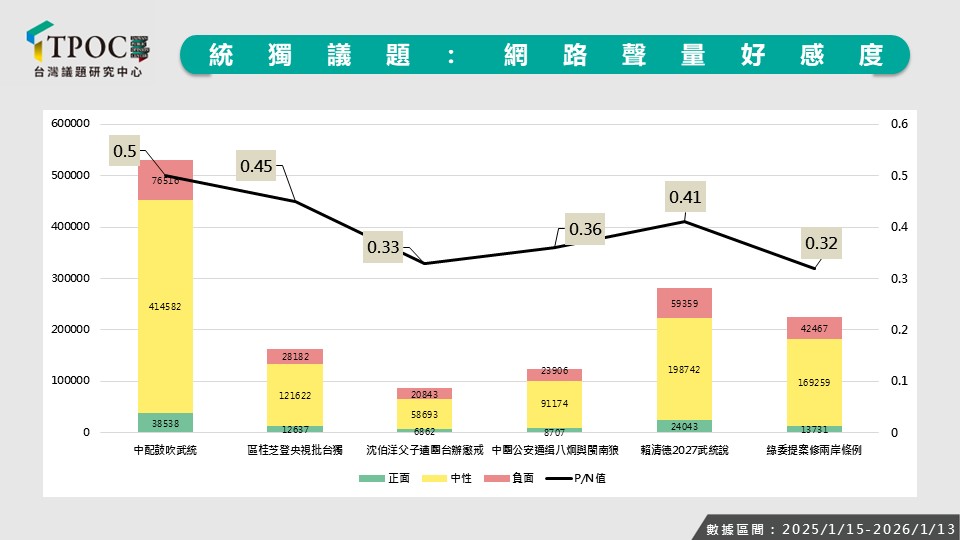 以總統賴清德「中國2027武統臺灣」的發文為例,正面聲量多來自綠營及其支持者的肯定與動員回應,負面聲量則集中於對升高衝突、挑起戰爭風險的疑慮;相較於在台灣獨立或兩岸統一之間選邊站,網路輿論中仍有相當比例的聲音傾向期待維持現狀的兩岸關係。
