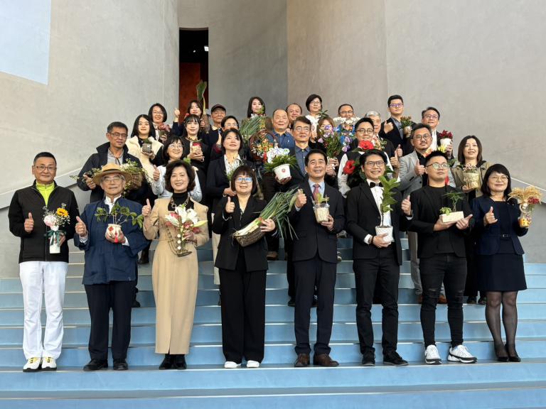 ▲台中市產業故事館發展協會第五屆理事長交接典禮,會員手捧象徵其產業的植物象徵整合行銷。(圖/高婕)