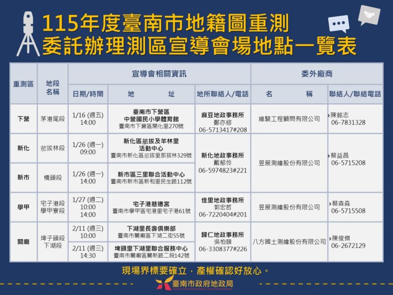 【今傳媒/記者張淑慧 報導】為協助重測區內土地所有權人充分了解作業內容與權益事項,臺南市政府地政局自115年1月16日起陸續舉辦5場「115年度臺南市地籍圖重測作業宣導會」,歡迎民眾踴躍參加。