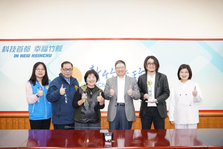 ▲新竹縣長楊文科表揚魏士翔(右二)、湯寶蓮(左三)。(圖/記者張建奎攝)