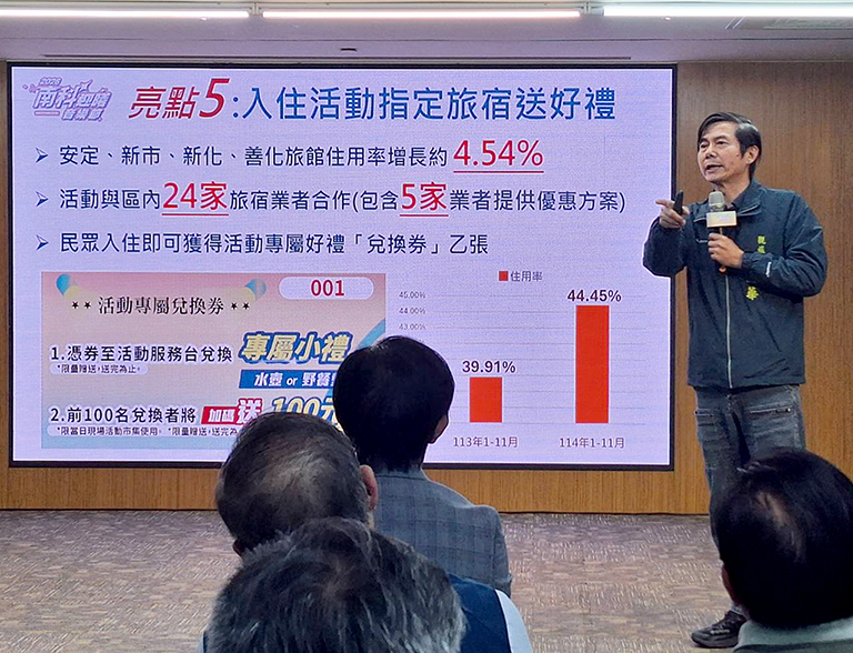 觀光旅遊局長林國華表示,南科周邊的新市、善化、安定及新化區114年1至11月旅宿住用率相較於113年同期成長約4.54%,而今(115)年活動也特別串聯這4區共24家的旅宿業者,且其中5家旅宿業者更特別推出住宿優惠專案(巨地花園渡假莊園、宇田商旅、新大南科大飯店、美墅館、貳樓居)。凡入住24家合作旅宿即可獲得活動專屬兌換券,憑券至當日活動現場服務台兌換專屬小禮一份(水壺或野餐墊),前100名兌換者將加碼送市集券各100元(限當日現場活動市集使用,送完為止),鼓勵民眾不僅參與活動,也能順遊新市及周邊景點,規劃一趟輕鬆愉快的旅遊行程。