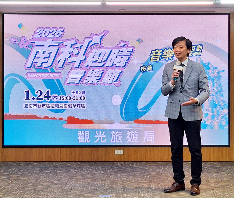 臺南市葉澤山副市長代表黃偉哲市長出席記者會致詞時表示,南科除了是科技產業的重鎮,更是台灣科學園區的龍頭,周邊也擁有包含南科考古館、樹谷園區、虎頭埤風景區與新化老街等觀光資源,是同時展現文化與科技的絕佳地點。而市府過大型活動「2026南科迎曦音樂節」的舉辦,結合迎曦湖優美的自然環境,規劃白天親子活動、夜晚音樂演唱會,並可同步欣賞「龍來台灣」燈光秀展演,不僅提供民眾多元豐富的休閒選擇,也有助於延長停留時間、促進在地消費。