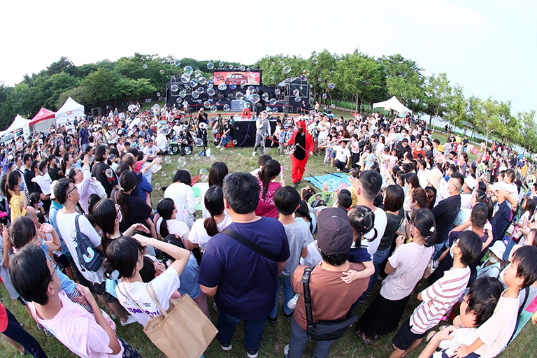 ▲活動現場下午將有主題式氣墊城堡、大型泡泡派對、AKUBA FUNK樂團演唱、天馬戲劇團的歡樂小丑秀及親子大地遊戲等。