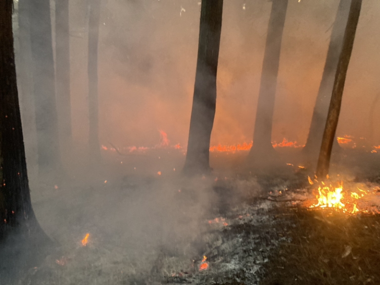 ▲救火隊觀測員115年1月15日下午3時抵達火場勘查,現場火勢猛烈。(新竹分署提供)