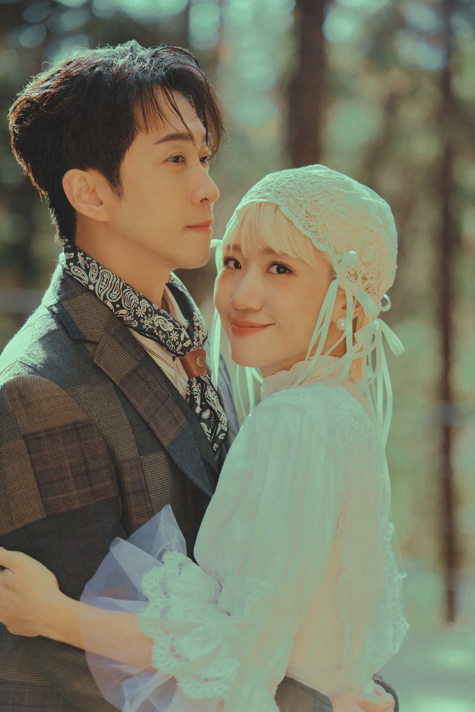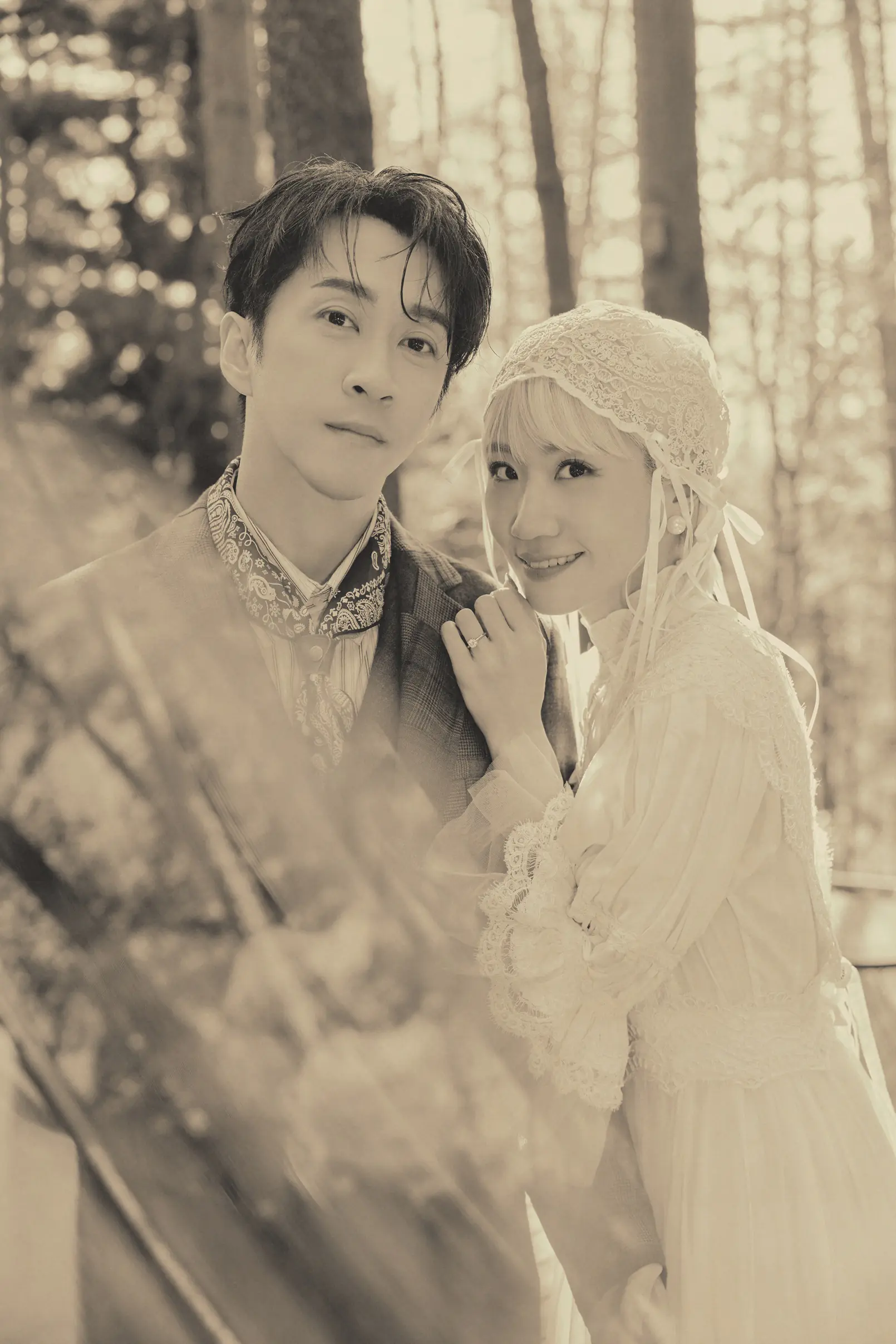 而另外一套日系典雅風婚紗則來自台灣設計師品牌「富松梅」,這套由設計師全手工製作的經典婚紗也暗藏親情命定巧合,LULU透露由於父母親在結婚 30 週年紀念時曾穿過該品牌,這次能自己再次穿上這個品牌拍婚紗,可說別具意義!由於拍攝場景選在虹夕諾雅的森林間,搭配陳漢典的美式復古西裝,整體畫面仙氣十足,整題呈現出宛如老電影般的溫柔氣氛,也成為她心中最喜歡的造型之一;LULU坦言,自己在安排每一套婚紗時,腦中都已先有對應場景,「很幸運的是,最後幾乎都能照著我腦海中的畫面一一完成。」