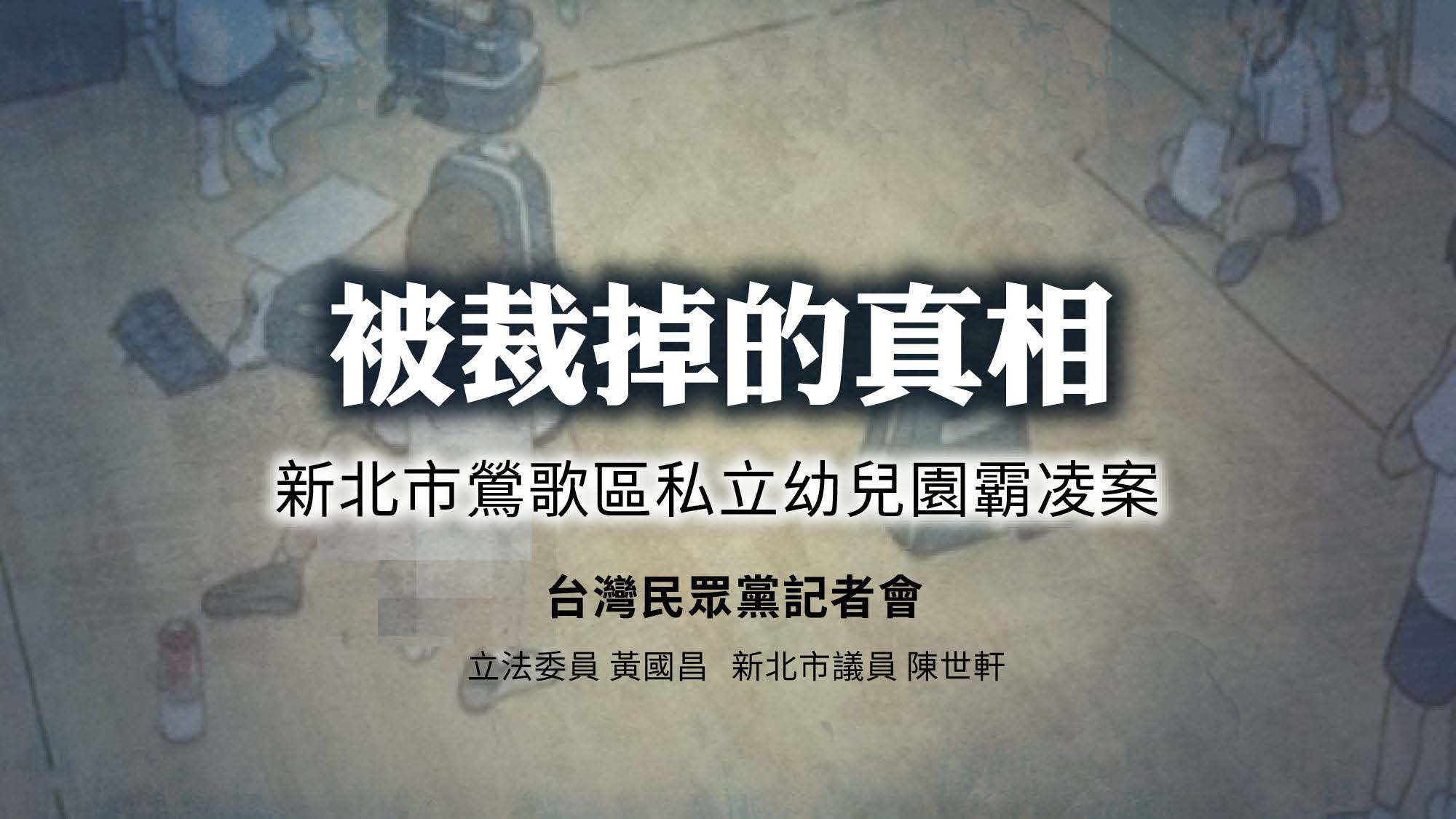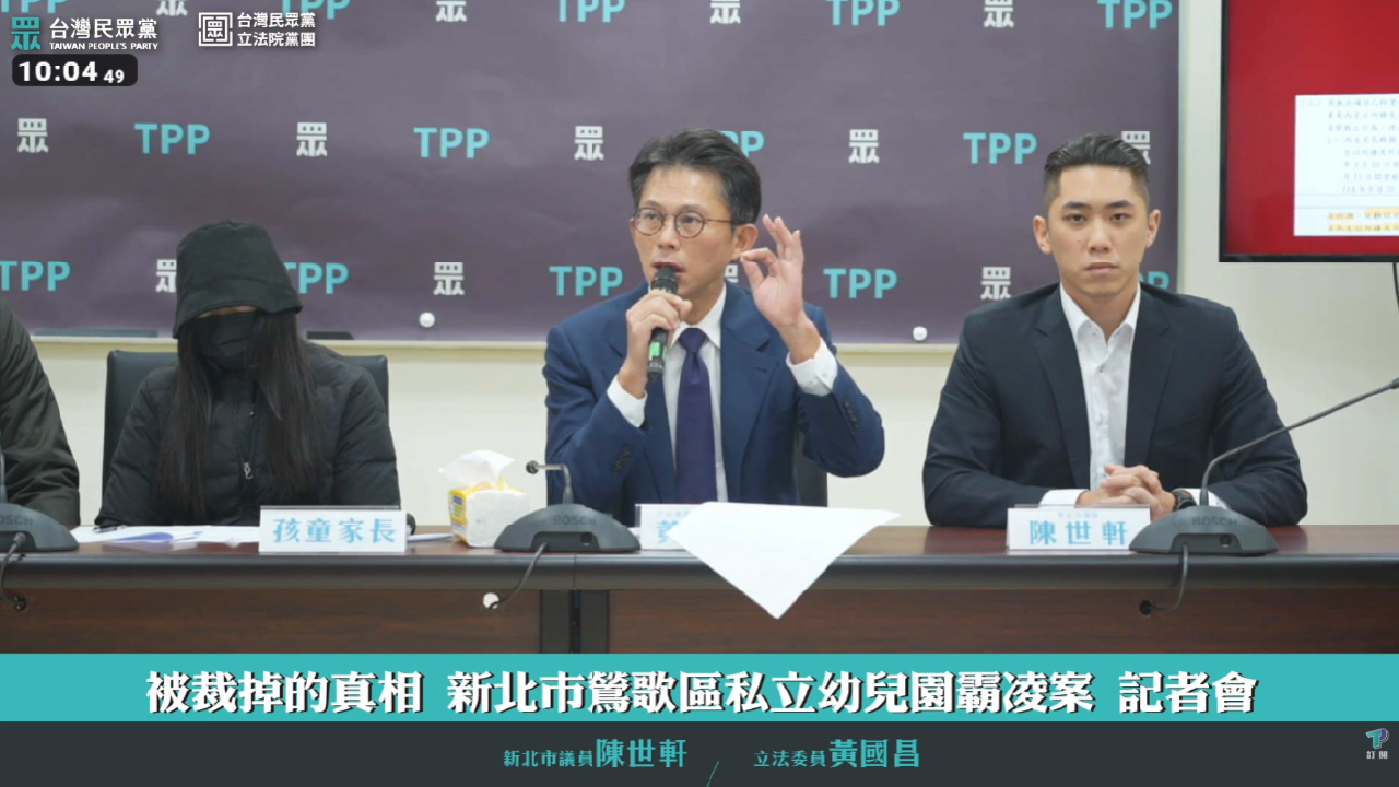 台灣民眾黨立委黃國昌與新北市議員陳世軒今(21)日召開記者會,揭露新北市鶯歌區一所私立幼兒園霸凌案的真相。該案發生於去年9月,一名3歲幼童在園內遭不當對待,衣服被助教強制脫除、裸著下半身在全班面前擦地,導致孩子出現嚴重心理創傷,半夜驚恐哭喊「不要」。