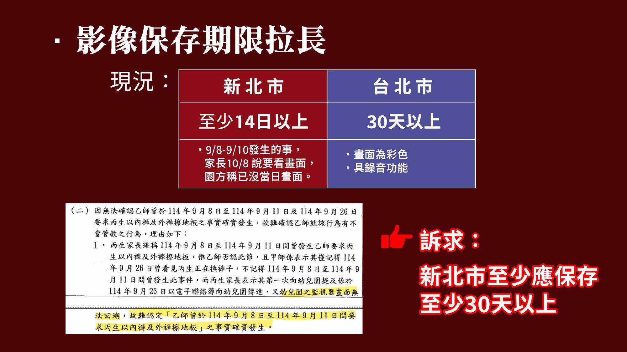 黃國昌要求新北市監視器影像保存期限應至少30天以上,比照台北市標準,並呼籲國教署辦法應明確規範負責人之責任與訴追,指定專責人員負責管理,建立防覆蓋機制。他強調:「孩子的創傷不是48秒,真相也不該只剩48秒。我們今天不是要道歉,我們要真相加制度。」