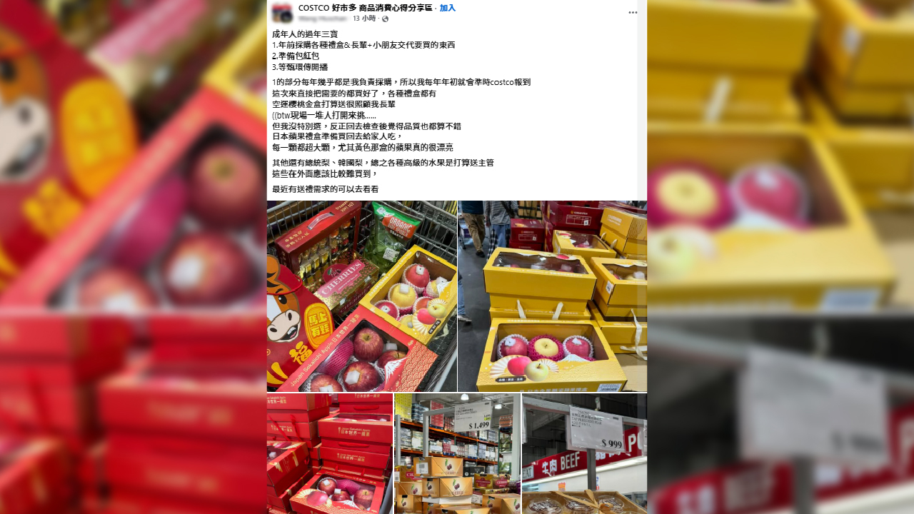 有網友在社群平台分享年前採購經驗,表示自己每年都會在好市多採購各種禮盒及年貨。此次購買的商品包括空運櫻桃金盒、日本蘋果禮盒、總統梨、韓國梨等進口水果。該網友提到,雖然現場有部分消費者會打開櫻桃禮盒挑選,但自己選擇直接購買,回家打開後確認品質也相當不錯。