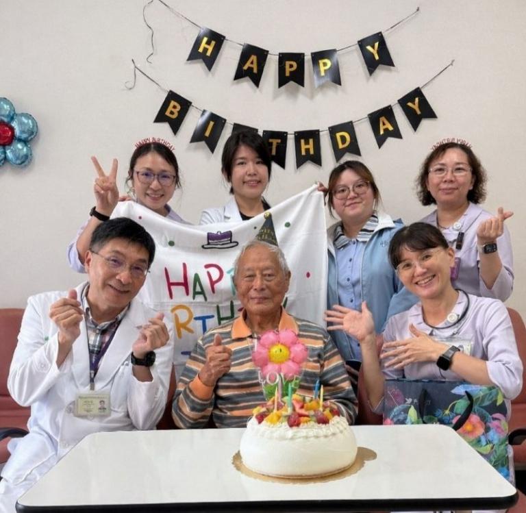 楊忠煒醫師與腹膜透析團隊日前為年逾85歲的喻爺爺舉辦生日慶祝,他是腹膜透析室年紀最長的病人,接受治療已滿3年,仍維持良好的生活品質,以堅毅與樂觀態度打破「高齡不適合腹膜透析」的迷思,是位模範腎友。