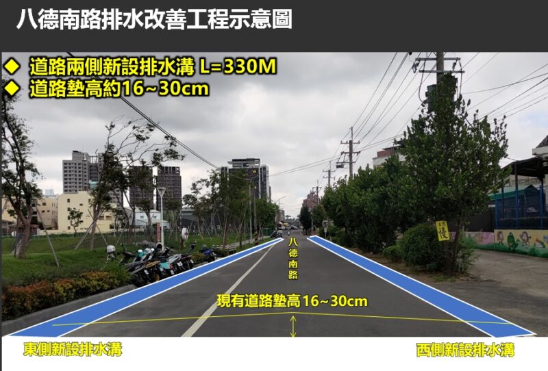 水利局表示,本次工程將針對低窪路段墊高約16至30公分,並於道路兩側新設側溝,總長約330公尺;完工後雨水可經由下游既有箱涵排入北屋排水,提升通洪能力,降低豪雨期間積淹水風險。