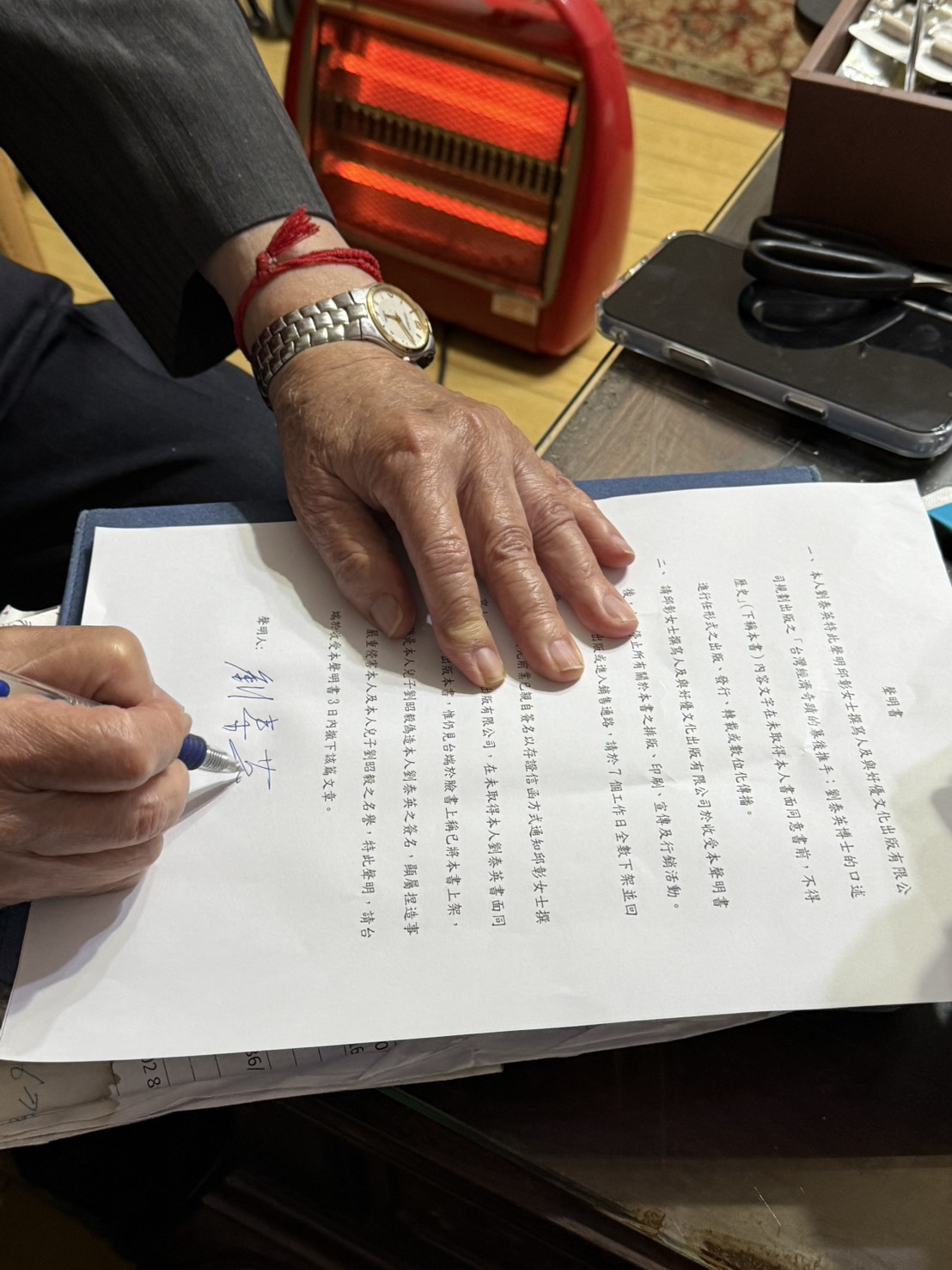 本人劉泰英先前業已親自簽名以存證信函方式通知邱彰女士撰寫人及與好優文化出版有限公司,在未取得本人劉泰英書面同意書前不得出版本書,惟仍見台端於臉書上稱已將本書上架,甚且稱是本人兒子劉昭毅偽造本人劉泰英之簽名,顯屬捏造事實,嚴重侵害本人及本人兒子劉昭毅之名譽,特此聲明,請台端於收受本聲明書3日內撤下該篇文章。