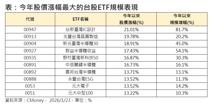 00947今天早盤上漲逾3%,居台股ETF漲幅之冠;若從規模來看,根據CMoney統計至1/23止,00947今年以來規模飆升81.7%,成為台股ETF中,績效、規模雙雙一馬當先的高人氣ETF。