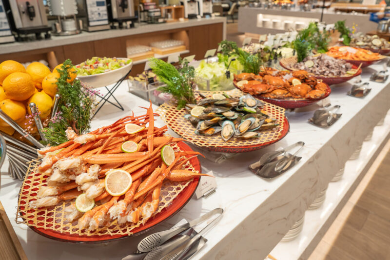 假日場次更推出松葉蟹吃到飽,搭配海膽干貝、現切爐烤牛肉等頂級食材,用餐體驗更加豪華澎湃。餐廳並提供冰淇淋機、啤酒機暢飲服務,滿足賓客味蕾饗宴。為提升用餐品質,榕廷百匯導入QR Code現點現做服務,賓客只需在座位上掃碼點餐,熱騰騰的現做料理即由服務人員送上桌,免去排隊等候。餐後更可享受琳瑯滿目的精緻甜點櫃,為美食之旅劃下完美句點。