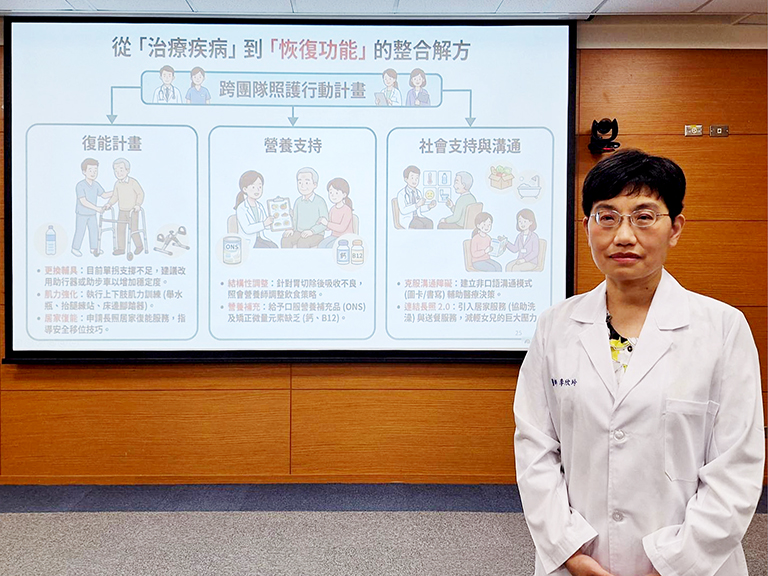 李欣玲醫師提醒,分辨「正常老化」與「病理性老化」至關重要。正常老化,如老花眼或動脈硬化屬於漸進性過程;若出現記憶力嚴重喪失、反覆跌倒或非預期體重減輕,則可能是病理性老化,應及早接受專業評估。成大醫院高齡醫學部透過每週跨團隊會議,結合醫師、護理師、藥師、營養師、社工師、復健治療師與臨床心理師等專業,為高齡長者量身打造照護計畫。藉由早期篩檢與跨領域合作,即便是90歲的長者,也能像「不倒翁」一樣,在跌倒後重新站起,維持有尊嚴與品質的晚年生活。