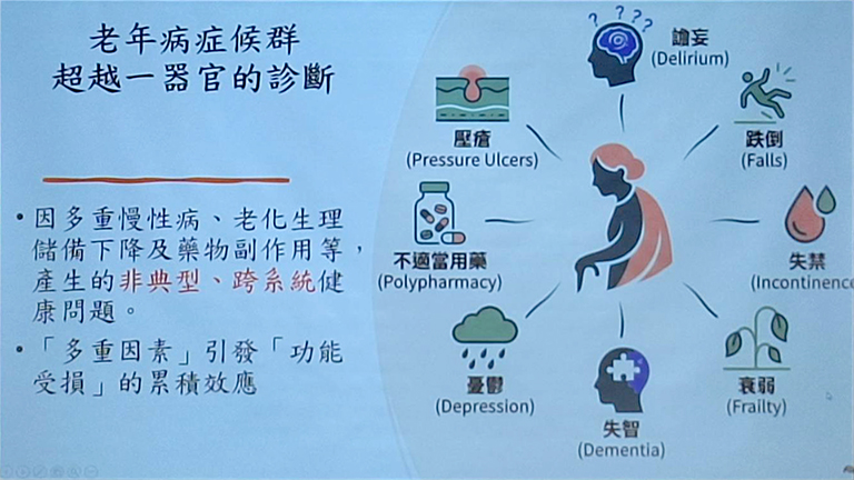成大醫院高齡醫學部李欣玲醫師指出,台灣人口老化速度驚人,面對超高齡海嘯,醫療思維從傳統的「治癒疾病(Cure Disease)」,轉而以「照顧功能(Care for Function)」為導向。許多長者出現跌倒、譫妄、尿失禁、憂鬱、行動力下降或衰弱等表現,這些統稱為「老年病症候群(Geriatric Syndrome)」,代表身體多重系統功能儲備量下降,遇到疾病時,便難以維持生理平衡。若將老化視為一條曲線,高齡醫學的目標是協助長者在疾病或急性事件後及早復能,回到原本的老化曲線,避免進入失能依賴的惡性循環。