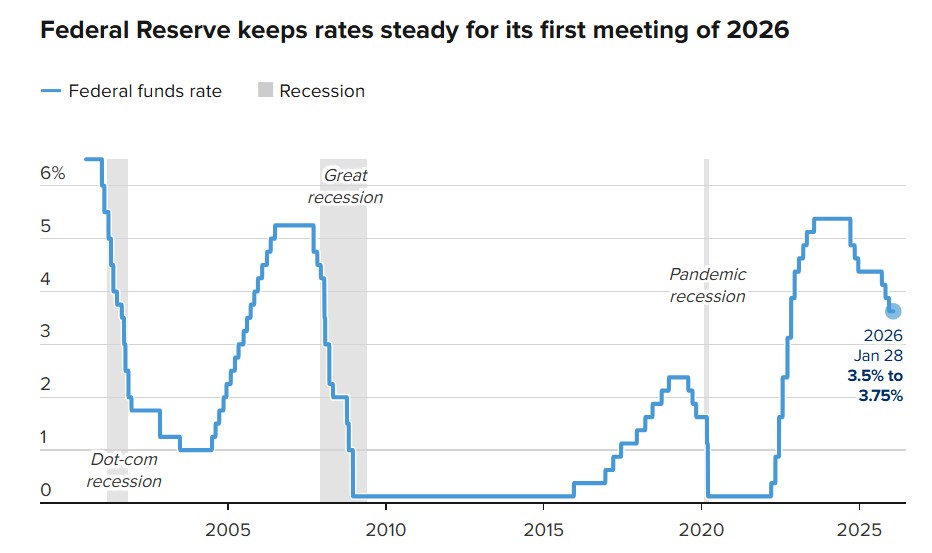 美國聯邦公開市場委員會(FOMC)今天一如預期,維持聯邦基準利率目標區間3.5%至3.75%不變,終結了先前連續3次降息。 市場預期聯準會至少要等到6月,才會再次調整基準利率。