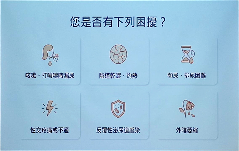 新樓醫院婦產科李佩蓁醫師提及,尿失禁與更年期相關的生殖泌尿道症狀,常被誤認為正常老化而被忽略,實際上已有安全且有效的治療方式。依據統計顯示,45歲以上婦女超過五成有尿失禁問題,停經後更有約50至90%出現陰道乾澀、灼熱、性交疼痛、頻尿或反覆泌尿道感染等不適。