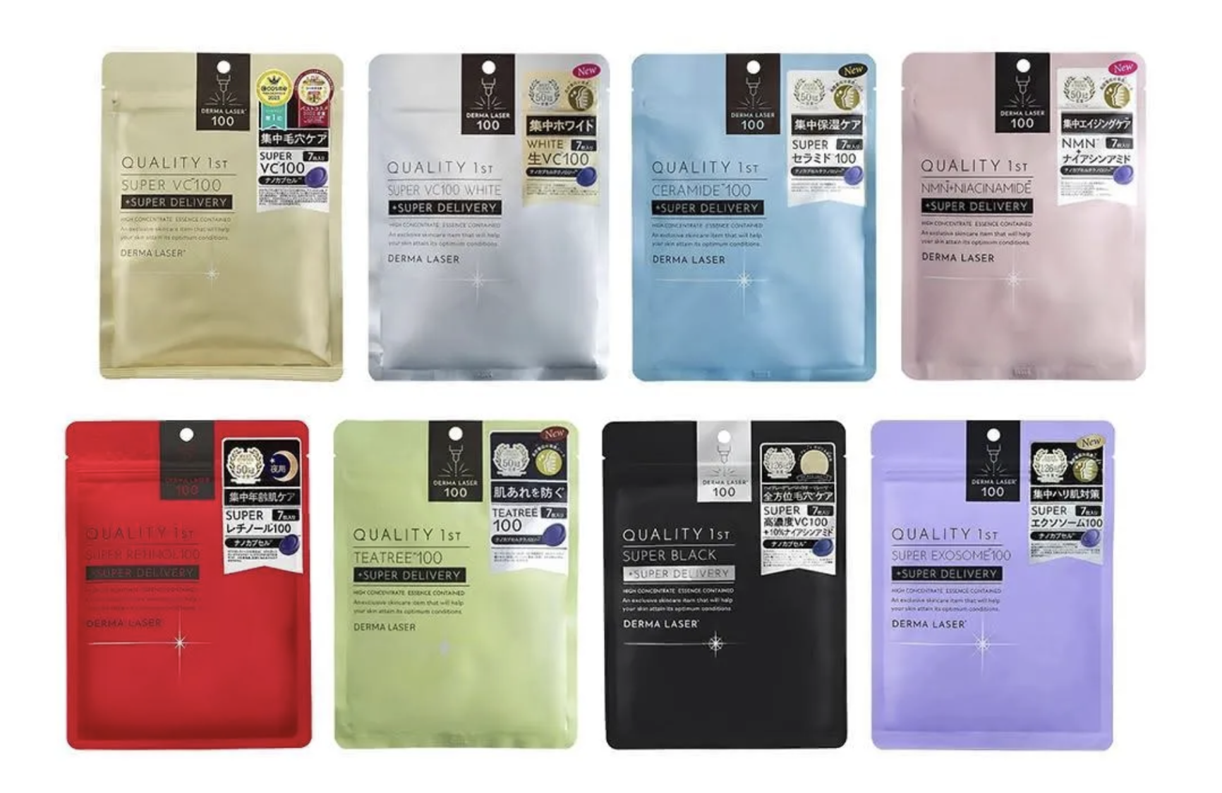 Quality 1st 的 VC100 系列在日本雜誌《LDK》獲得 A 級評價,以「3 分鐘快速保養」概念受到上班族喜愛。金色包裝以維他命 C 衍生物為主要成分,紅色包裝則偏向夜間保養概念。面膜布薄透、精華液含量充足,是許多旅客赴日會回購的品牌。