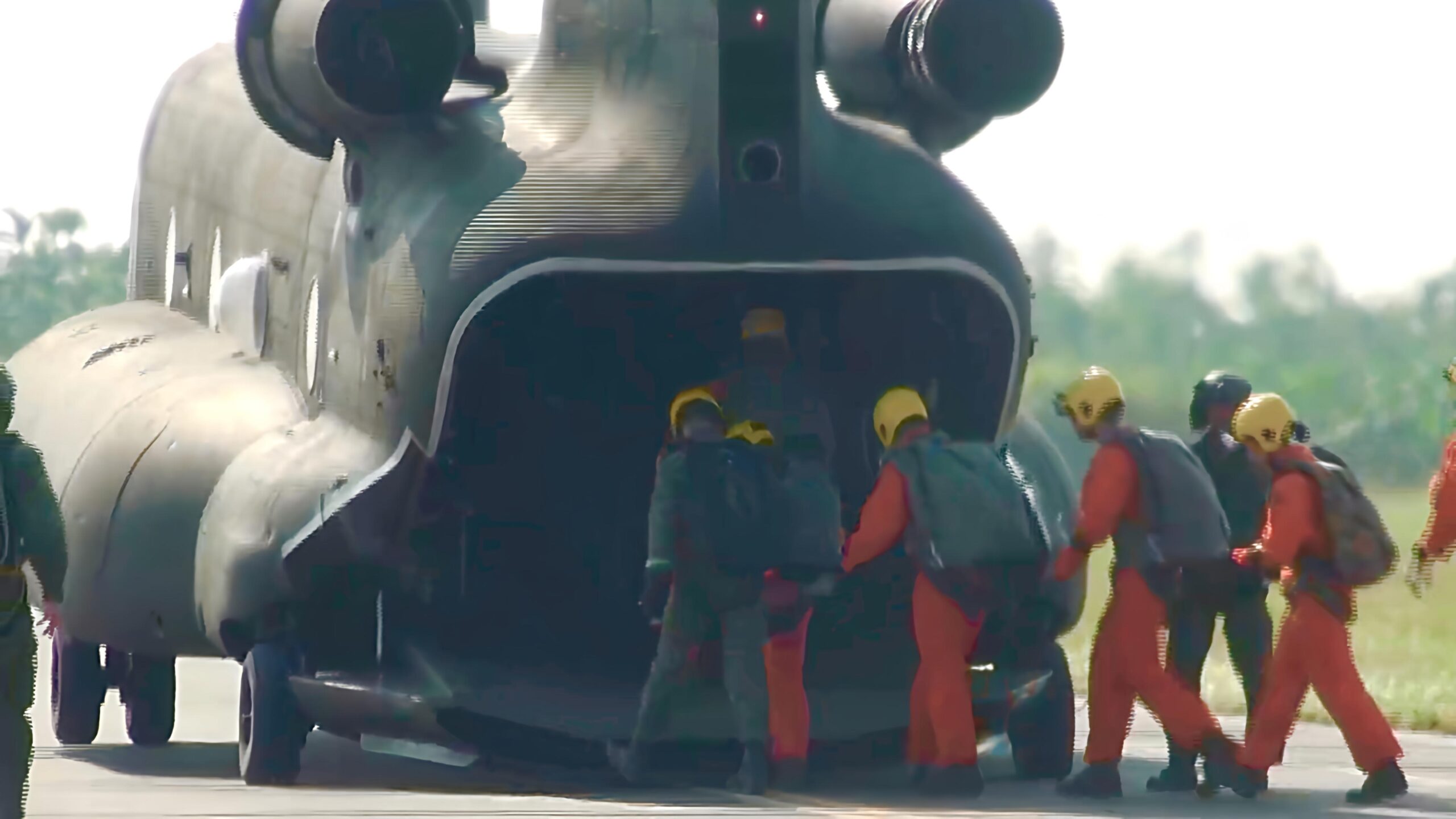 陸軍航特部空降訓練中心於屏東潮州空降場實施高空滲透跳傘訓練,官兵自CH-47SD直升機登機。(圖/記者莊全成攝)