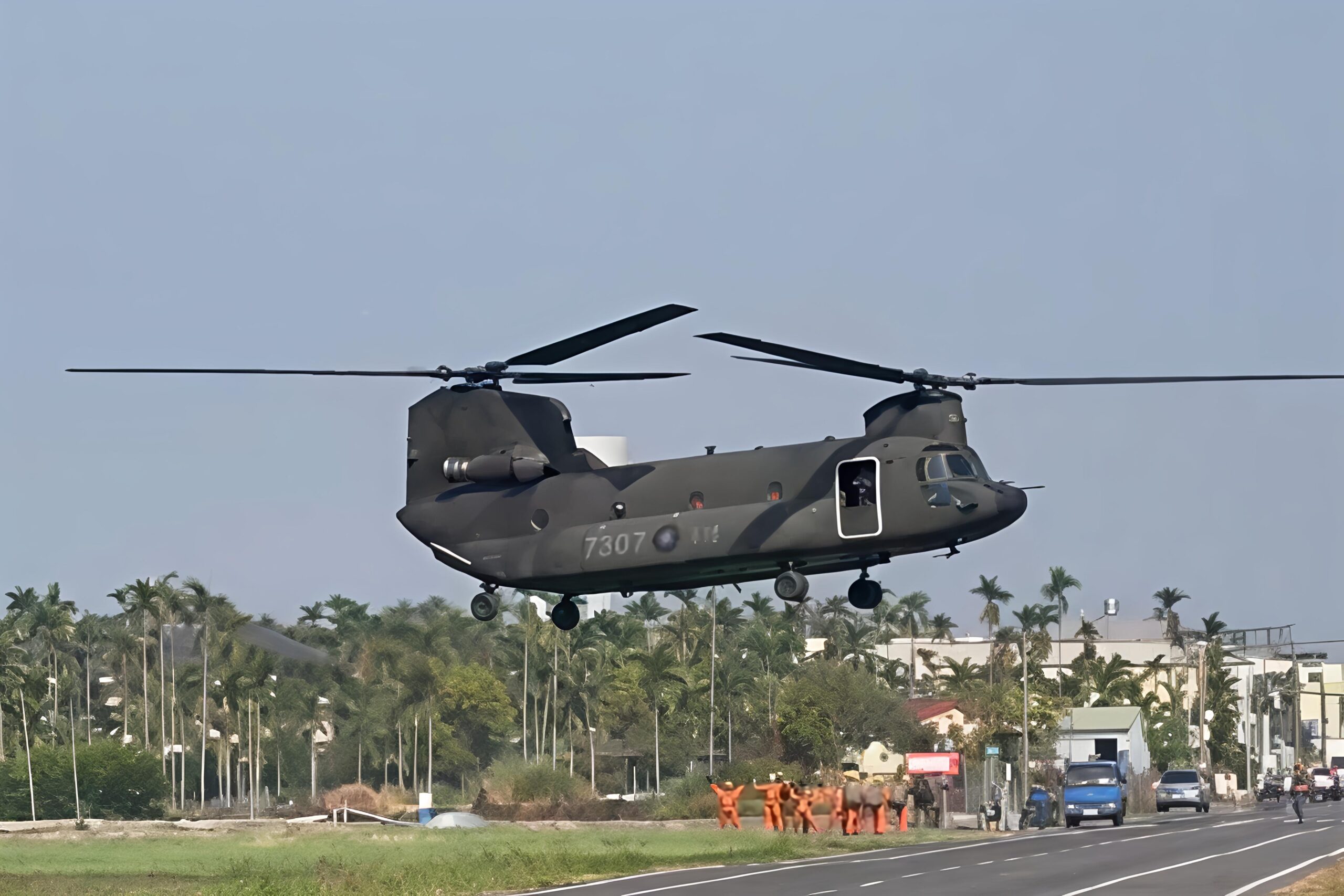 ▲CH-47SD運輸直升機升空,分別自8,000英呎及10,000英呎高度,進行高空跳傘課目。(圖/記者莊全成攝)