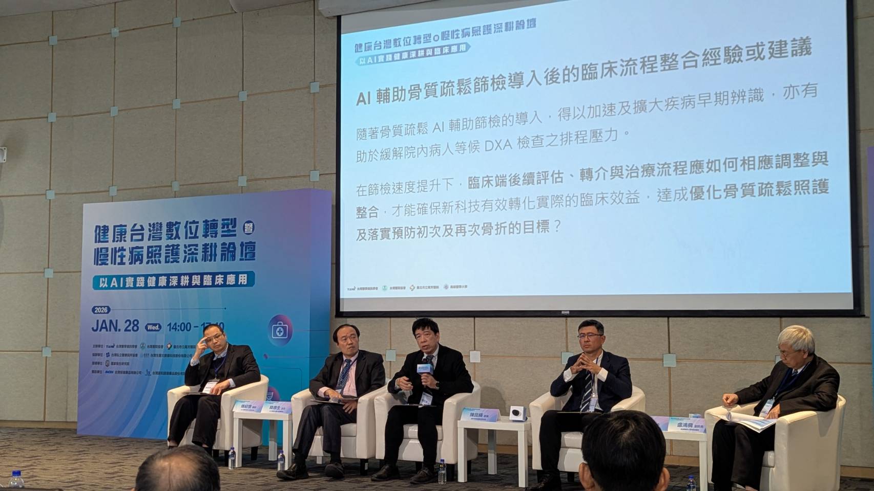 論壇中專家亦針對骨質疏鬆症藉由AI X光影像輔助辨識現況,由高雄醫學大學附設醫院盧鴻興副院長邀集臨床專家,從不同照護層級探討臨床應用與發展方向進行交流。台中榮總陳昆輝部長指出,藉分析十萬餘張X光片發現,約有16%個案未曾接受骨質疏鬆症篩檢,其中更有九成已罹患骨鬆,顯示臨床仍有未被及早辨識的高風險族群。