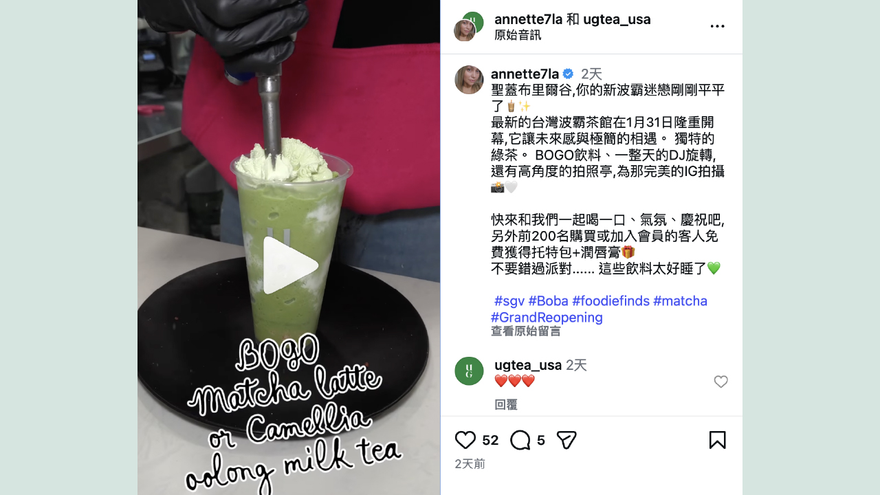 UG品牌以次世代茶飲概念進軍美國,主打低糖植物性飲品,結合台灣茶文化與創新抹茶口味,推出「下一層抹茶拿鐵」與「山茶花烏龍奶茶」等特色產品。重開幕當日更祭出買一送一優惠,前200名顧客加入會員即贈送UG潤唇膏與托特包,並設置Instagram打卡拍照亭,成功創造話題聲量。有多位美國網紅在社群平台狂推UG,「像奶茶版的Gentle Monster」,還有深綠色調的沉浸式空間設計與層次分明的飲品視覺等都具特色,內容獲網友迴響,在洛杉磯626地區引發熱議。