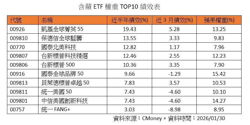 統計含「蘋」ETF共有23檔,持股權重前三高的分別為國泰全球品牌50(00916)、中信美國創新科技(009801),及凱基全球菁英55(00926),分別佔15.42%、14.27%,及13.25%;其中,凱基全球菁英55(00926)近半年、近3月績效都領先,且近半年績效近20%。