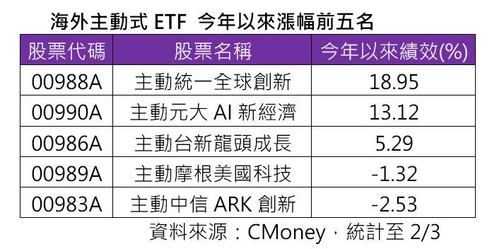 此外,海外主動式ETF,今年以來也不乏有好表現者,像是主動統一全球創新(00988A)累計漲幅18.9%,大幅領先美股NASDAQ與S&P500指數同期僅約2%的漲幅,也領先其他同類型ETF。