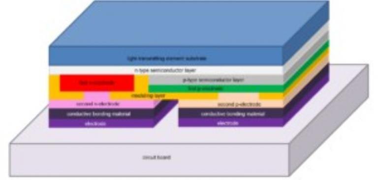 億光的US 7,554,126 專利涉及 LED 覆晶和封裝製程,是汽車照明市場的關鍵技術,透過調整 N/P 電極的面積比例,使 LED 晶片與焊料具有良好接著性,可兼顧高散熱及封裝可靠度,適用於高功率照明與顯示等領域,億光並提出美國覆晶專利US 7,554,126之LED覆晶及封裝技術的立體圖。
