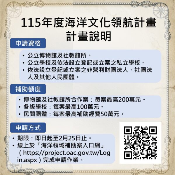 115年度海洋文化領航計畫徵件對象為各級學校、民間團體及博物館、社教館所,自即日起至115年2月25日止受理申請。本年度採線上申請方式,申請單位須至海洋委員會「海洋領域補助案入口網」(https://project.oac.gov.tw/Login.aspx)完成填報作業,並上傳相關計畫書及證明文件。本年度學校單位每案最高補助新臺幣100萬元,民間團體每案最高補助50萬元,公立博物館及社教館所每案合作經費最高為200萬元,期望透過各界參與,實現不同規模與型態的文化行動。