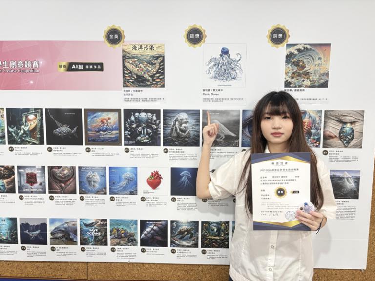 「AI 組」金獎由光復高中朱婉琪奪得,作品《海洋污染》以浮世繪工筆風格描繪海洋垃圾對生態的威脅,透過暗色巨鯨與群魚的強烈對比,揭示美麗表象下潛藏的污染真相,喚起大眾守護海洋的共同責任;銀獎由景文高中謝玟慧獲得,其作品《Plastic Ocean》以塑膠垃圾拼組成章魚形象,象徵海洋逐漸被人類廢棄物佔據,呼籲社會正視日益嚴峻的海洋污染問題;銅獎則由嘉義高商侯芸蓁榮獲,作品《武海》以武士揮刀守護遭塑膠吞噬的海洋為意象,點出人類在環境保護中責無旁貸的角色。