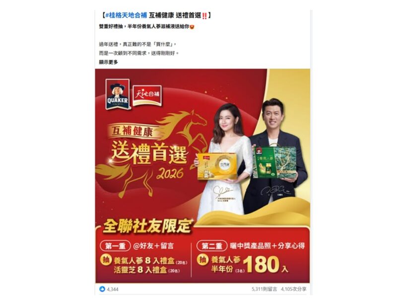 隨著年節健康送禮需求升溫,各大賣場通路也陸續推出新年促銷,帶動保健飲品禮盒買氣。新年期間,全聯、大全聯與愛買同步推出購買桂格/天地合補保健飲品禮盒,單筆滿699元即可參加萬元精品家電抽獎的活動;其中,全聯於2月26日前加碼單筆滿1,200元現折100元,大全聯則推出單筆滿2,500元送300元折價券。家樂福方面,即日起至2月24日,單筆滿999元可抽萬元3C好禮,單筆滿1,688元再享現折100元;愛買另於2月24日前加碼滿299元送30元電子折價券,讓消費者在年節採購時有更多實質回饋選擇。此外,購買桂格養氣人蔘94入限量套組,就能帶走24吋LINE FRIENDS在地特色前開式行李箱,附黃金刮刮卡,消費者有機會刮中最大獎–價值十萬元的黃金人蔘。