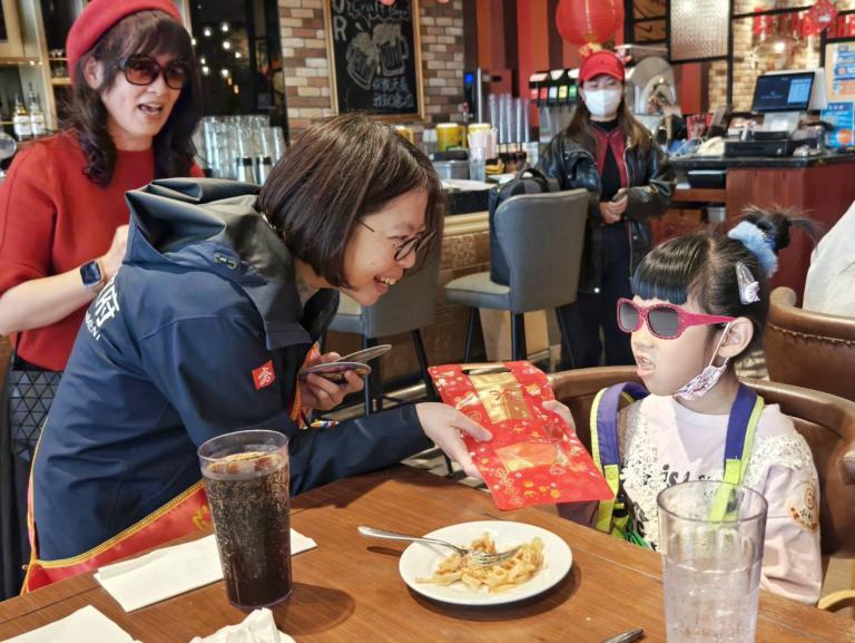 ▲蔡宛芬局長為每位兒少準備超人力霸王小紅包,小朋友收到超開心。(圖/社會局提供)